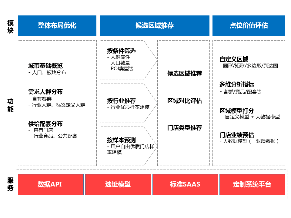 基于高德优势人地数据,以大数据模型及灵活定制能力服务实体选址:高德全域人口、地理数据及人地关系映射能力,突显选址服务核心优势;以业务目标为导向,以模型能力深挖数据价值,提升服务决策支持力;多种产品服务模式,组件化架构,支持客户多元定制需求,易于业务后向扩展。